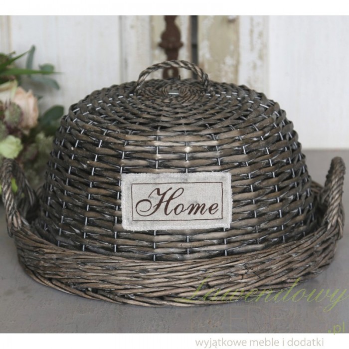 Okrągła wiklinowa taca z kloszem od firmy Shabby Chic z wygodnymi, także wiklinowych uchwytamipo przeciwległych stronach tacy. Wszytsko ręcznie plecione, wytrzymałe i bezpieczne. Jedyną ozdobą tego dziełą sztuki jest wydrukowany na materiale napis HOME, umieszczonu na froncie plecionego klosza z gałeczką.