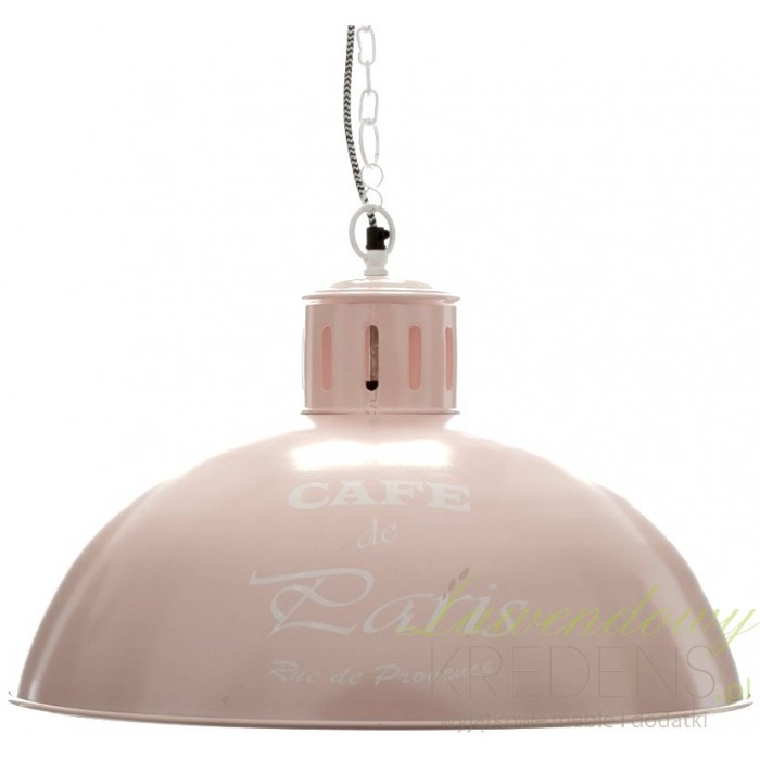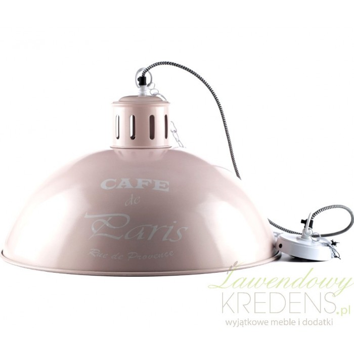 Lampa aluro ma metaliczny, blado różowy kolor z dużym białym napisem na środku Cafe de Paris. Metalowa różowa lampa idealnie pasuje do kobiecego pokoju, nadając mu ciepła i eteryczności. Zawieszona jest na długim metrowym łańcuchu. Lampy loftowe to świetne rozwiązanie do dużych, industrialnych pomieszczeń, w których wiodącą rolę pełni na przykład cegła.
