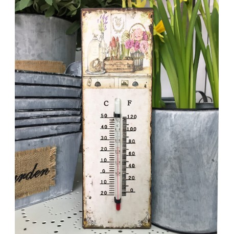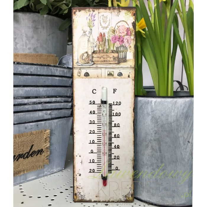 Prowansalskie dekoracje to przede wszystkim styl prowansalski, który cechują motywy kwiatowe i finezyjne linie oraz zdobienia. Termometr w stylu prowansalskim wykonany jest z metalu w kolorze białym. Posiada u góry nadruk przedstawiający szafkę i kwiaty. Termometr stylizowany jest na stary i zniszczony, co dodaje mu uroku i atrakcyjności.