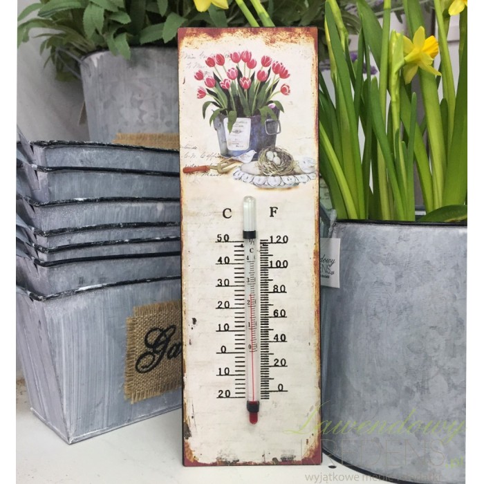 Prowansalskie dekoracje, to przedmioty funkcjonalne i ozdobne. Termometr w stylu prowansalskim, został umieszczony na metalowej blaszcze na której został umiejscowiony obrazek z jasnym tłem na którym można znaleźć duży bukiet tulipanów w wiaderku.