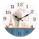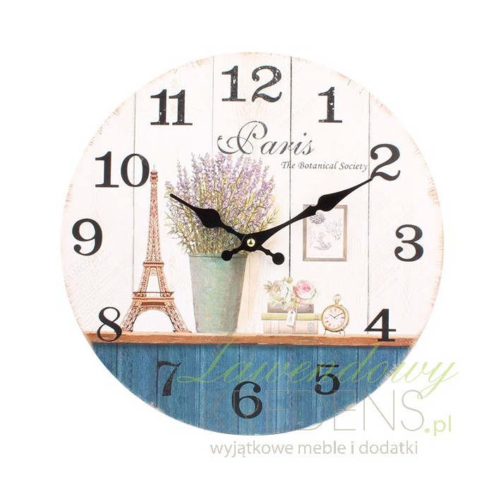 Okrągłe zegary ścienne wykonane na płycie MDF, których tarcza spełnia jednoczęśnie funkcę obrazu ze wzglęu na przepiękny, prowansaslki obrazek. Na tarczy widnieją figurka wieży Eiffla, lawenda w doniczce, książki oraz zegarek ustawione na niebieskim meblu i na tle drewninej ścany. Zegar prowansasalski nie tylko wskaże godzinę, ale także doda pomieszczeniu koloru.
