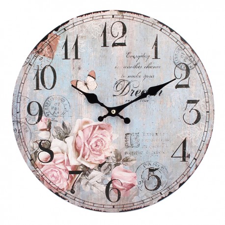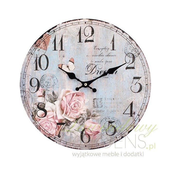 Ścienne zegary retro o okrągłej tarczy na której wiele się dzieje. na postarzanym błękitnym tle odbija sie bukiet różowo-bladych dzikich róż i przelatując za nimi motyl. Wszytsko to z czarnymi napisami i stemplami w tle. Do tego czarne wskazówki i duże cyfry i wspaniały dodatek do pokoju mamy gotowy!