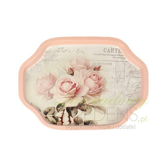 Dodatki w stylu prowansalskim, a wśród nich taca prowansalska to wspaniały dodatek do wnętrza, nadający mu niepowtarzalny klimat i styl. Taca metalowa ma ciekawy, nierównomierny kształt w kobiecych kolorach. Na środku znajduje się duży bukiet róż, a wokoło znajdują się napisy w języku francuskim.