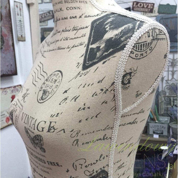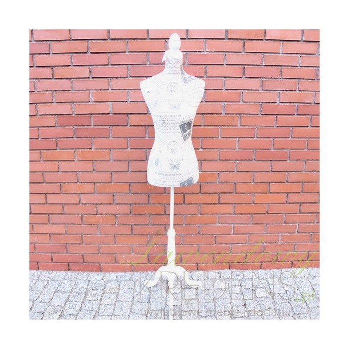 Pięknie wykończony dekoracyjnymi naszywkami manekin ozdobny, ustawiony na wysokiej postawie zakończonej trójnogiem. Kształt manekina wiernie odwzorowywuje górną część kobiecego korpusu, od szyi aż po biodra. Jest to doskonała alternatywa dla zwykłych wieszaków bądź wspaniały prezent dla początkujących miłośników krawiectwa.