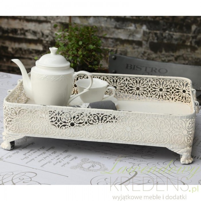 Zjawiskowa metalowa taca od firmy Chic Antique reprezentuje dodatki w stylu prowansalskim z najwyższej półki. Świetnie sprawdzająca się jako taca podczas spotkania z przyjaciółmi jak i stoliczek na sobotnie śniadania do łóżka, gdyż dzięki wysokim brzegom jest stabilna i wytrzymała. A te przepiękne ażurowe wycięcia? Mistrzostwo!