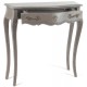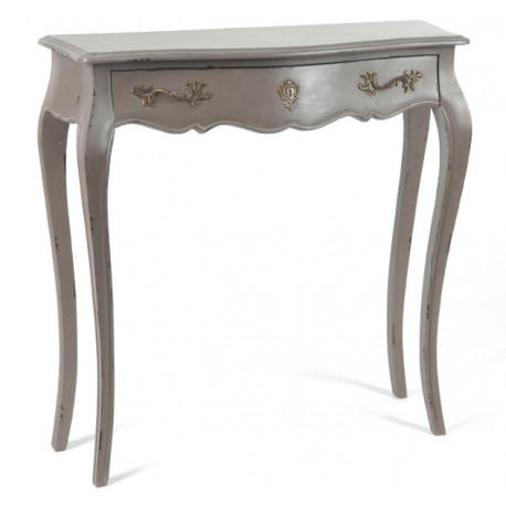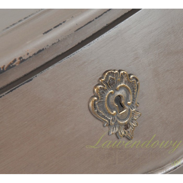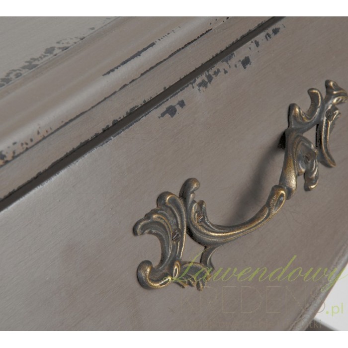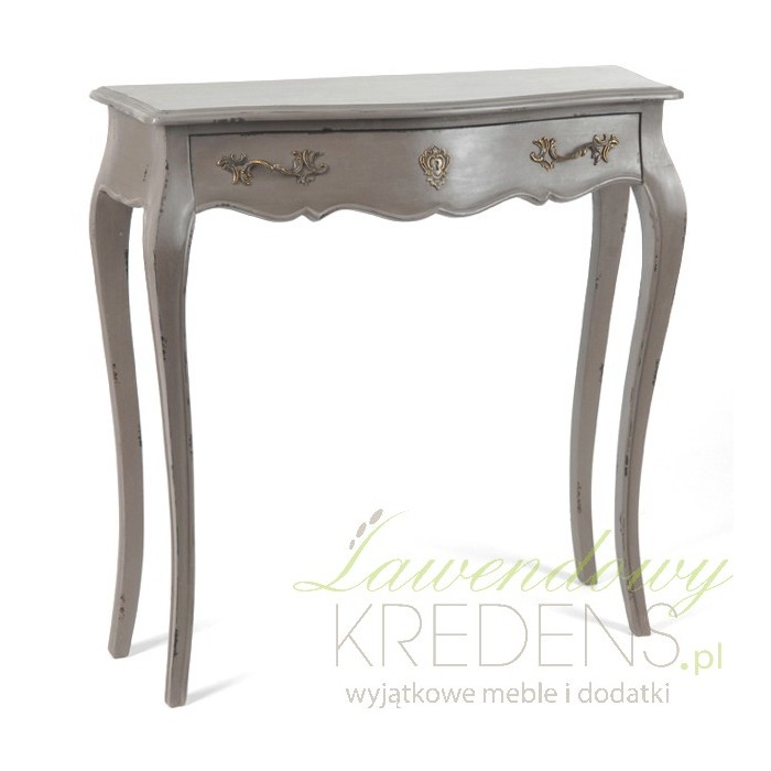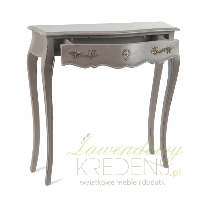 Proporcjonalna konsola prowansalska w odcieniu brązowo-szarym, zaakcentowana metalowymi zdobieniami frontu szuflady w kolorze brudnego złota. Znakomita forma konsoli sprawia, że z przyjemnością można ją zaadaptować na sypialnianą toaletkę czy podręczne biurko!