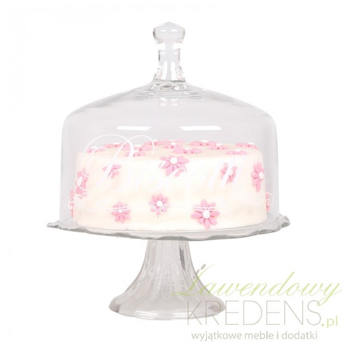 Wspaniała szklana patera na nóżce z pojemną pokrywą z bardzo wygodnym uchwytem! Na kloszu patery znajduje się biały napis Biscotti.