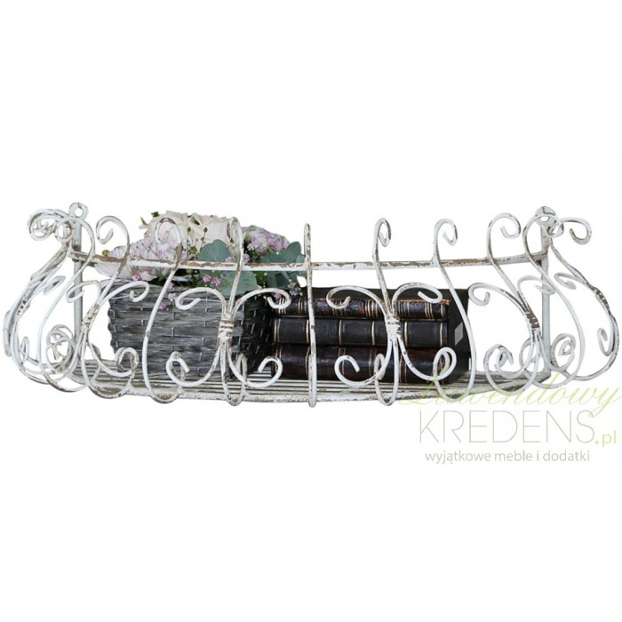 Ozdobny, pełen skomplikowanych elementów balkonik, czyli doskonale podkreślająca prowansalskie spojrzenie na świat, metalowa półka od Chic Antique, tak na kwiaty jak i na książki czy kosmetyki. Z taką dekoracją na ścianie zbędne będą jakiekolwiek obrazy czy wisiorki.