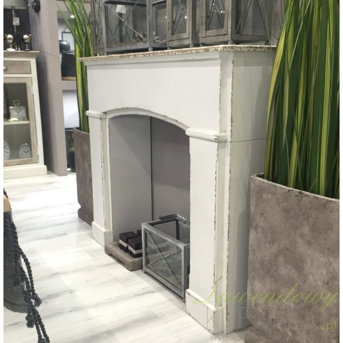 Ekskluzywna obudowa kominka w kolorze białym, z delikatnie rzucającą się w oczy drewnianą półką!