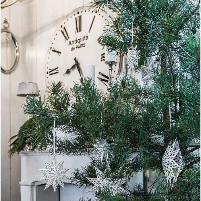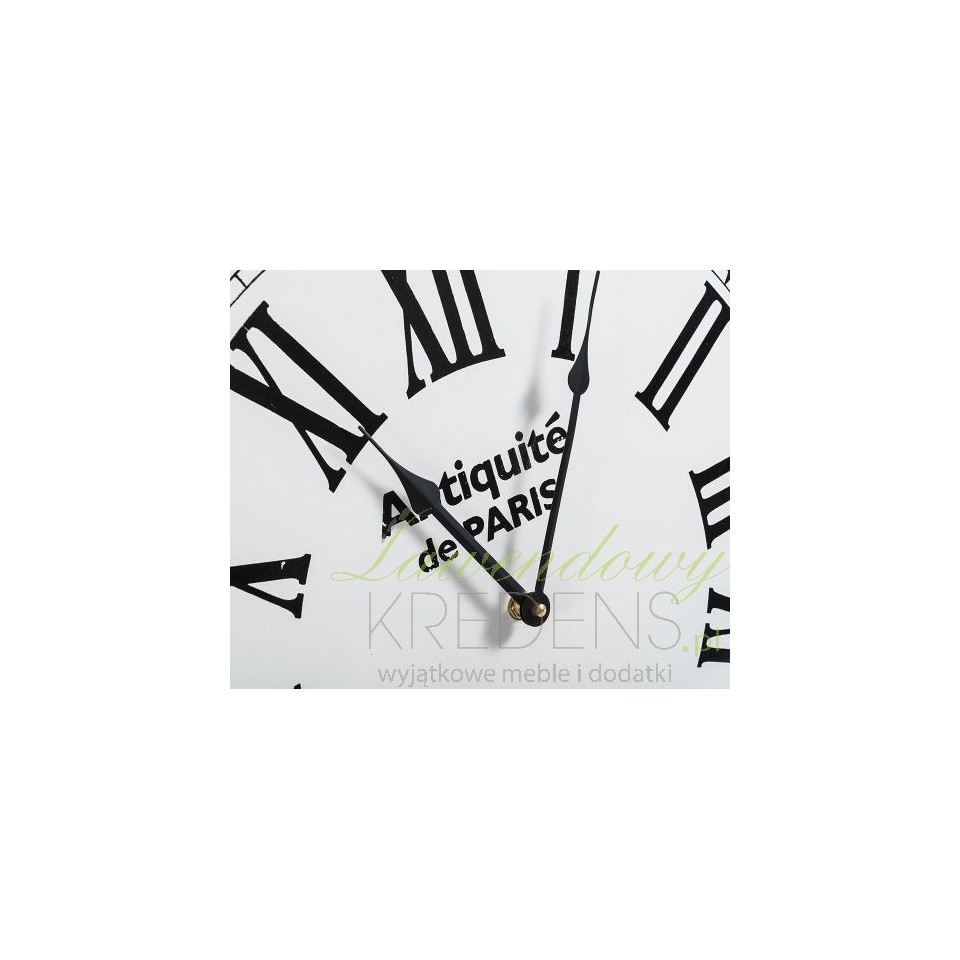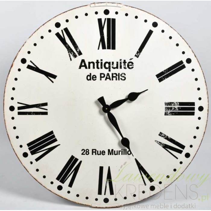 Duży zegar marki Belldeco z jasną tarczą i czarnymi cyframi i wskazówkami, na których tle widcoczne są napisy w języku francuskim. O jego wyjątkowości świadczy nie tylko rozmiar tarczy, ale także z pozoru niewyróżniająca sie stylistyka, która w odpowiednim otoczeniu nabiera kolorytów klimatu retro!