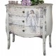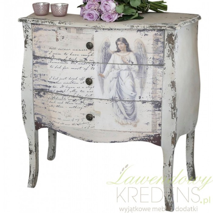 Posiadająca trzy bardzo pojemne, szerokie szuflady komoda prowansalska, której znakiem szczególnym jest duży wizerunek ubranego w biała szatę Anioła ze szkrzydłami, znajdujący się na froncie szuflad, z prawej strony od uchwytów. Grafika ta w połączeniu z wyraźnymi otarciami i zadrapaniami na powierzchni tworzy niezwykłe połączenie, które zapada w pamięć!