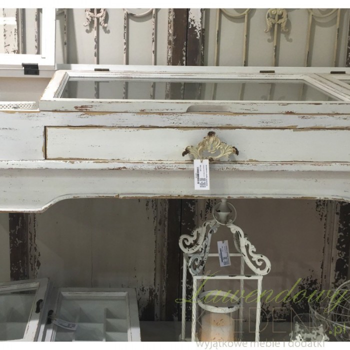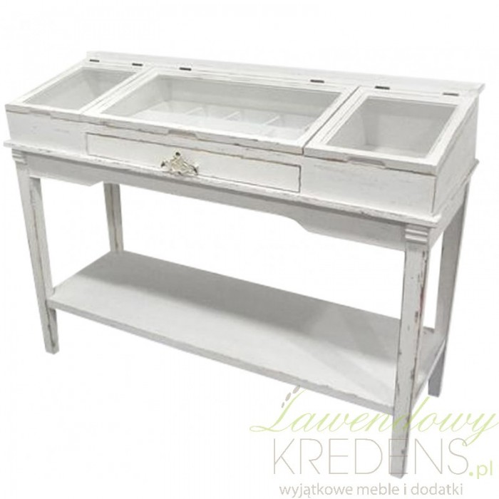 Fascynująca, drewniana konsola w stylu prowansalskim, z delikatnie pochylonym, przeszklonym blatem, pod którym kryją się półki!