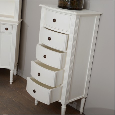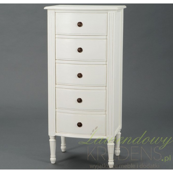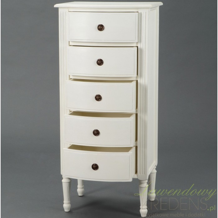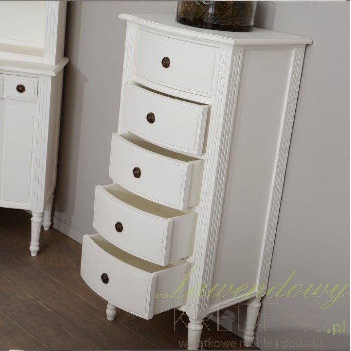 Pełna wdzięku białą komoda prowansalska z pięcioma szufladami w pionowym układzie, wygodna i użyteczna!
