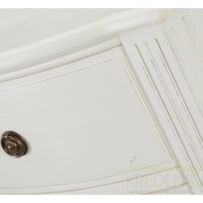 Kompaktowa komoda w stylu prowansalskim, cechująca się urokiem i praktycznością. Delikatnie łukowaty front optycznie sprawia, że przestrzeń wokół jest większa, nie umniejszające jednocześnie pojemności szuflad. Specjalne uchwyty przy szufladach nie wystają, co wpływa na bezpieczeństwo.