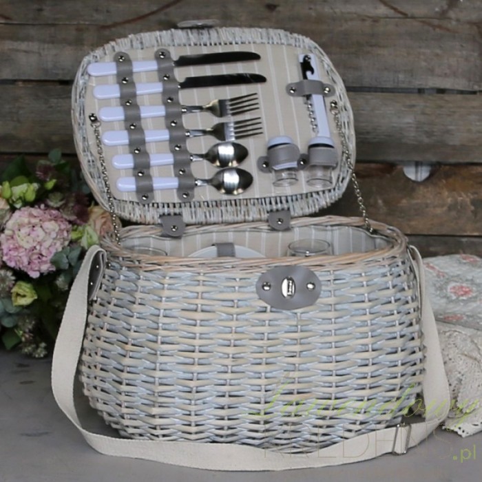 Profesjonalnie wykonany i wyposażony kosz piknikowy z wygodnym paskiem na ramię i zamykany solidna pokrywą. Chic Antique przygotowało dla Was rewelacyjny dodatek, który z pewnością podbije Wasze serca. W skład kosza wchodzą: łyżki, widelce, noże, talerze, kieliczki, wszystko w liczbie dwóch sztuk, a także otwieracz do wina.