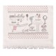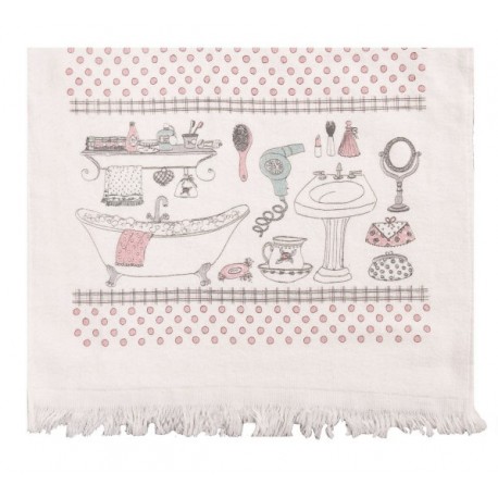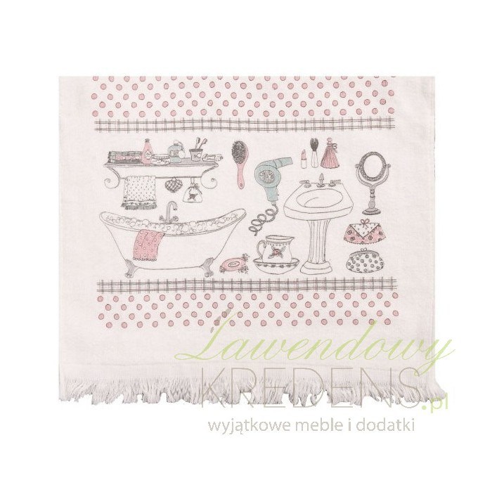 Ręcznik do rąk wykonany z bawełny w białym kolorze, posiada kilka motywów takich jak: wanna, szczotka do włosów, lusterko, suszarka, umywalka, dzięki którym da się zauważyć, że jest do idealny ręczniczek do łazienki.