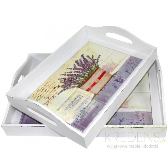 Drewniana taca prowansalska z ceramicznymi elementami, ozdobiona dużą grafiką z realistycznym motywem lawendy!