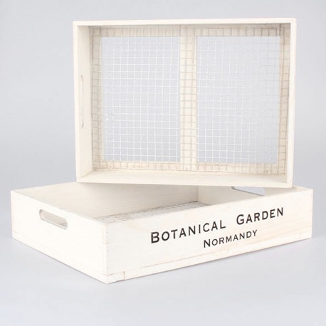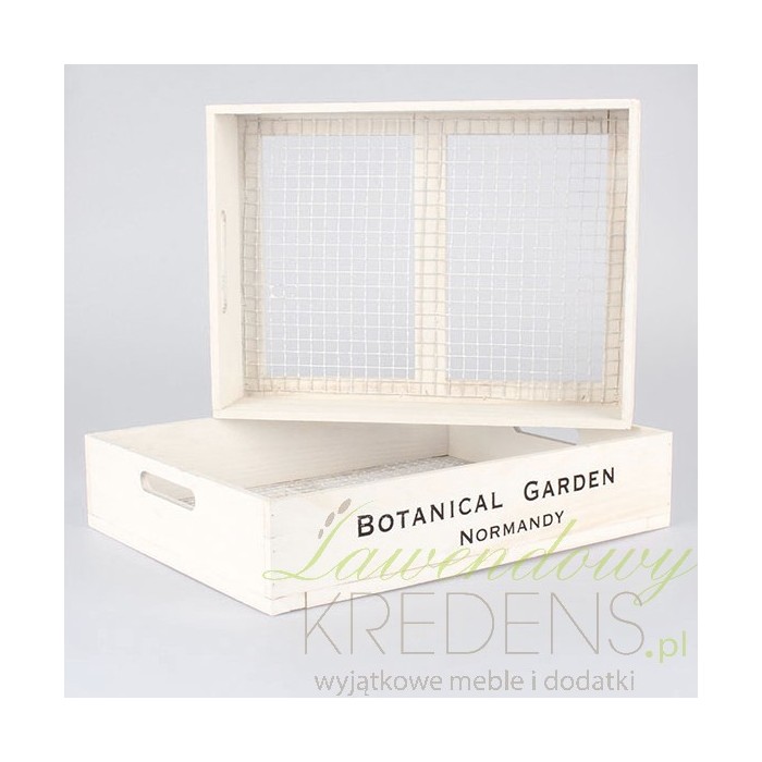 Dodatki w stylu prowansalskim, a wśród nich drewniana skrzynka na kwiatki dodadzą mieszkaniu osobliwego uroku. Skrzynka na kwiaty lub roślinki wykonana jest z drewna w kolorze białym z czarnymi angielskimi napisami Botanical Garden. Drewniana skrzynka może posłużyć jako taca na naczynia, która posiada dwa poręczne uchwyty do przenoszenia. Świetna do baru czy restauracji.
