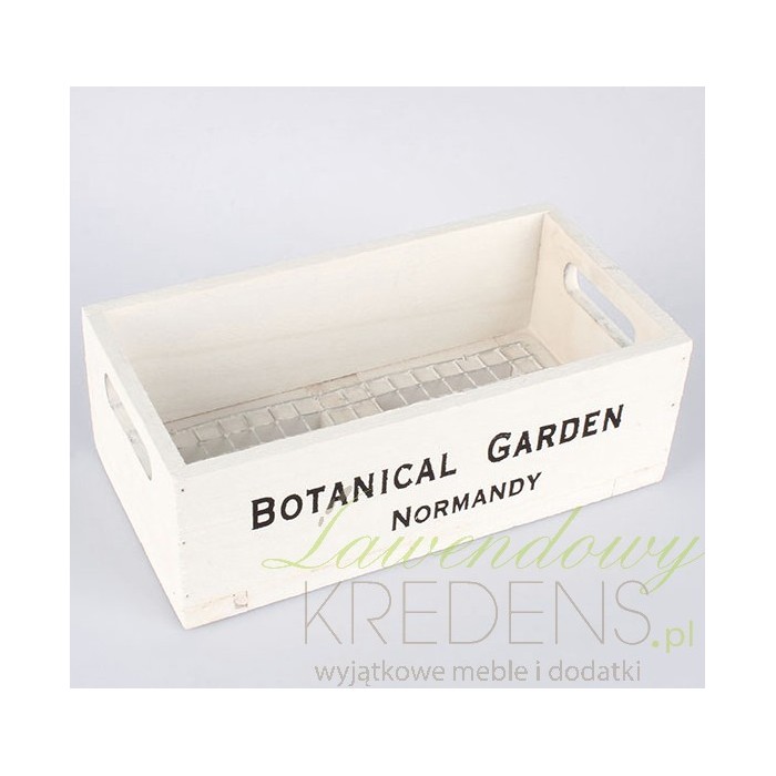 Dodatki w stylu prowansalskim a wśród nich skrzynka na kwiaty to świetna dekoracja okna czy werandy, a przy tym świetny pomysł na ochronę ulubionych kwiatków. Drewniana skrzynka ma prostokątny kształt i niewielkie wymiary. Na dole posiada praktyczną kratkę i solidne boczne uchwyty do przeniesienia. Skrzynka ma biały kolor i czarne napisy Botanical Garden Normandy.