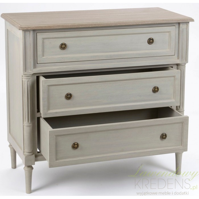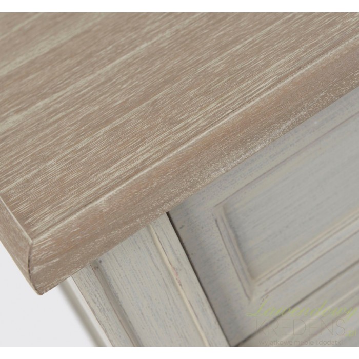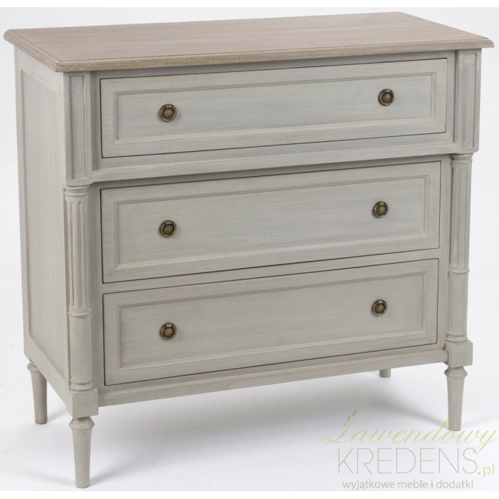 Ozdobna, szara komoda w stylu prowansalskim o przeznaczeniu które zadecydujesz samodzielnie. Trzy pojemne szuflady z prostymi frontami, otwierane za pomocą nowoczesnych, metalowych uchwytów. Przełamaniem klasyki jest drewniany blat w kolorze bardzo zbliżonym do naturalnego.