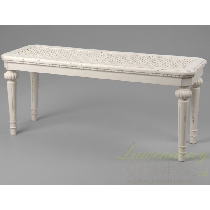 Wyjątkowa, miejscami delikatnie postarzana ława w stylu francuskim, wąska ale stosunkowo długa. Ustawiona została na czterech stabilnych nogach, na powierzchniach których widać pionowe wgłębienia. Najbardziej rzucającym sie w oczy elementem wykonania jest blat z dziurami, które imitują siatkę!