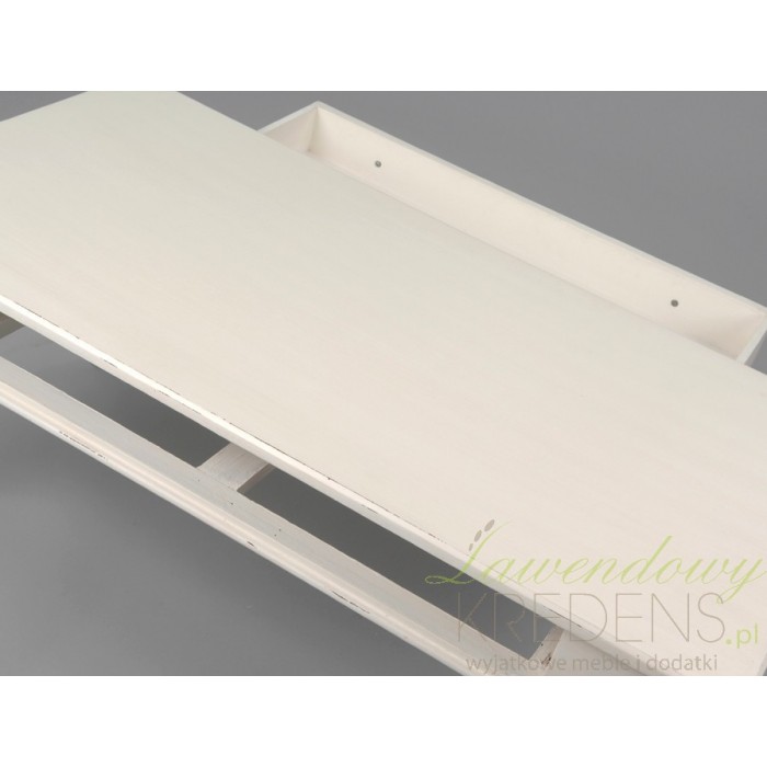 Niski, salonowy stolik kawowy w kremowym odcieniu, który wyróżnia się bardzo głęboką podblatową szufladą!