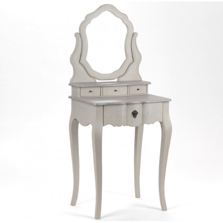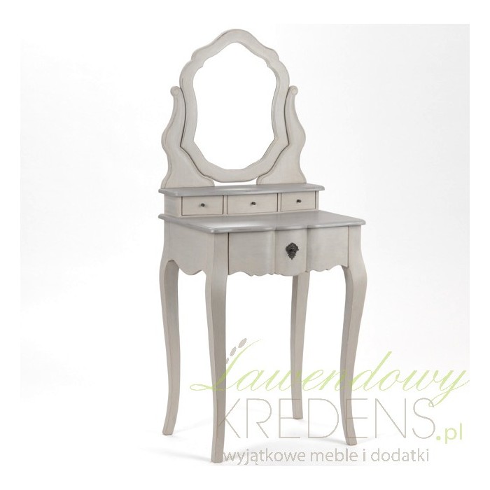 Szara toaletka z linii mebli prowansalskich Prowansja, dzięki której poczujesz się jak prawdziwa dama. Duży blat z dużą szufladą z dekoracyjnym frontem i trzema mniejszymi szufladkami bezpośrednio pod lusterkiem zapewnią odpowiednią ilość miejsca dla Twoich akcesoriów. Nie zastanawiaj się dłużej i kup ją już dziś!