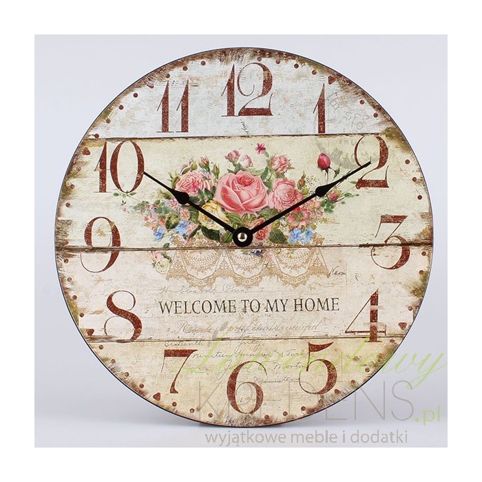 Nastojowy i stylowy prowansalski zegar, na któego tarczy widoczna jest wiżanka kolorowych kwiatów w pastelowych kolorach. Całość na tle jasnego beżu z poroznymi postarzeniami to świetny dodatek, który odmieni Twoje wnętrze. Wyjątkowe zegary ścienne zasilane pojedynczą baterią AA to fantastyczne dodatki w stylu prowansalskim!
