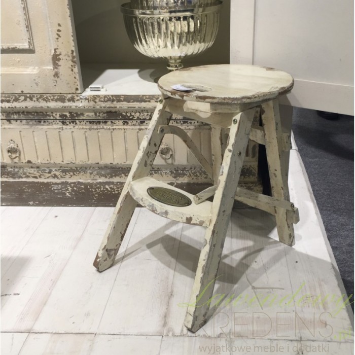 Kremowy stołek postarzany o okrągłym siedzisku o wyraźnie niesymetrycznej budowie, która ma też przyciągacć wzrok. Można spojrzeć też na ten postarzany stołek jako malutką drabinkę z jednym stopniem, na którą możemy stanąć sięgając do górnych części mebli!