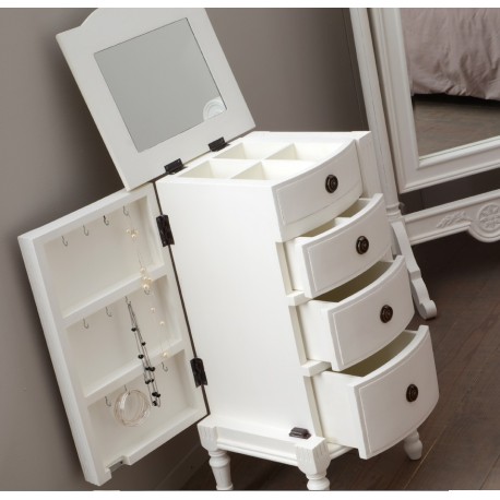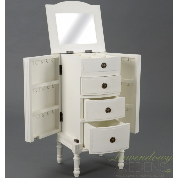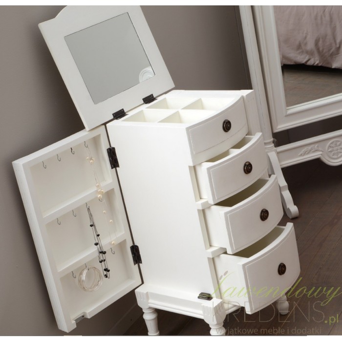 Zaprojektowana w sposób przemyślany i idealny dla kobiecych wnętrz, szafka na biżuterię, ze specjalnie otwieranymi bocznymi skrzydłami, na których są umieszczone liczne haczyki na naszyjniki czy bransoletki. Dodatkowo, otwierana od góry półka z dużym, wygodnym lustrem, posiada odpowiednio przedzielone segmenty, ułatwiające utrzymanie porządku!