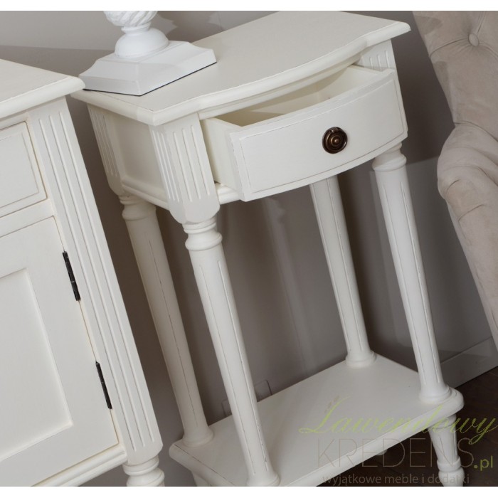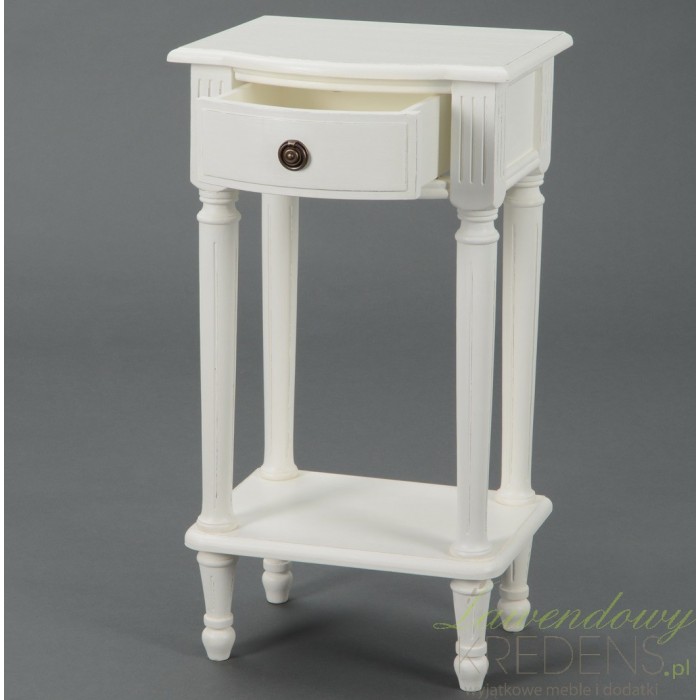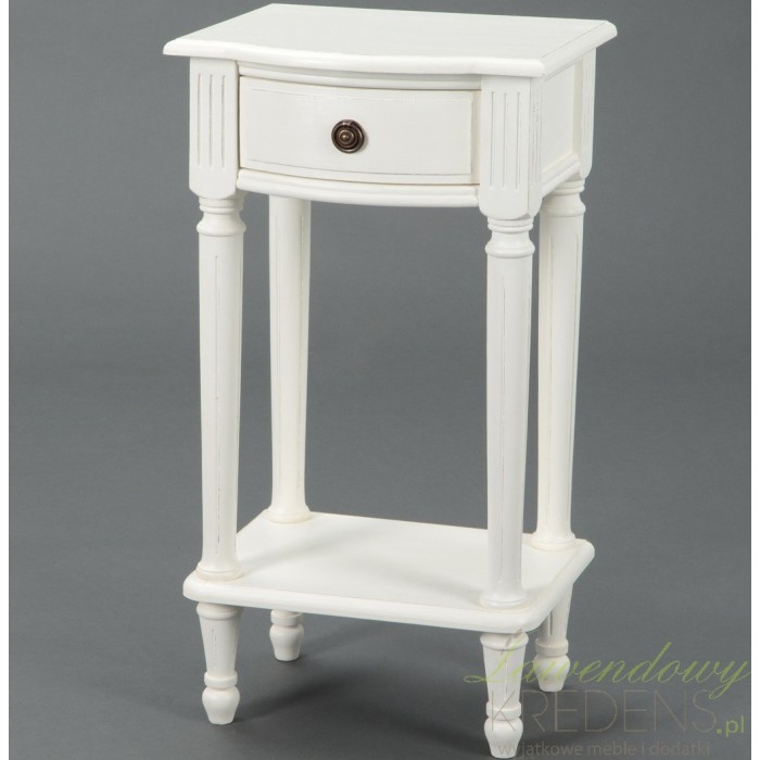 Biała, pełna uroku, szafka prowansalska, ozdobiona jedynie pionowymi żłobieniamina nogach i skromnie wyciętym blatem z wybrzuszeniem. Taka forma spodoba się zapewne lubiącym proste, ale pełne wdzięku meble w s tylu prowansalskim. Szafkę wyposażono dodatkowo w dolną półkę i niewielką, ale podręczną szufladę:)
