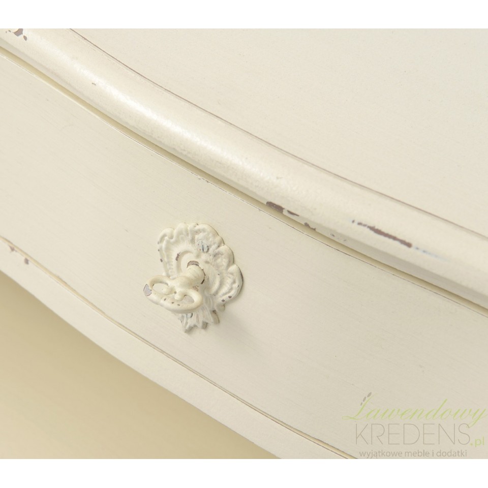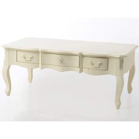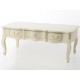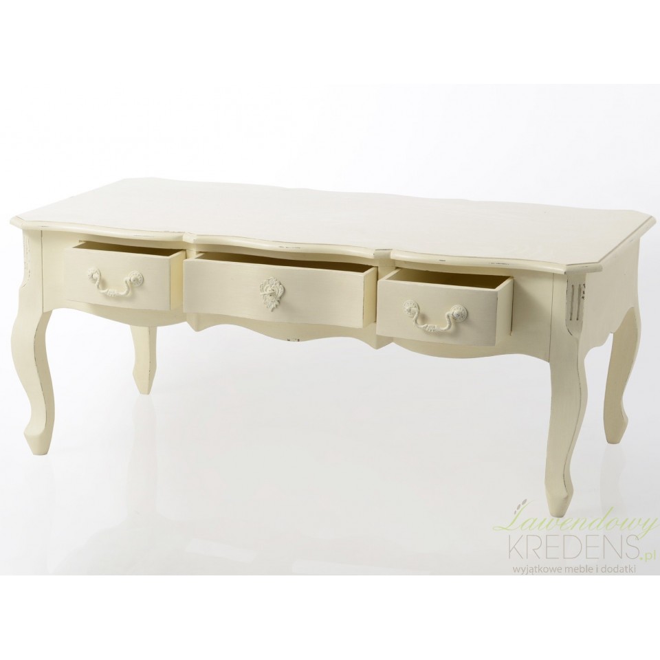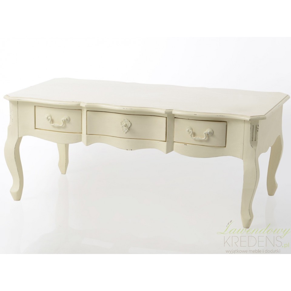 Niski stolik prowansalski o kremowej, matowej powierzchni, miejscowo poocieranej i zadrapanej specjalną techniką postarzającą. Taki zabieg nadaje meblowi wdzięku i sprawia, że mebel ma duszę. Wyśmienity stolik kawowy to świetne rozwiązanie do salonu, gdzie kruluje wygodna, ale stosunkowo niska kanapa. Miejsce idealne na popołudniowy relaks!