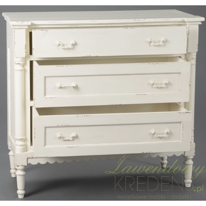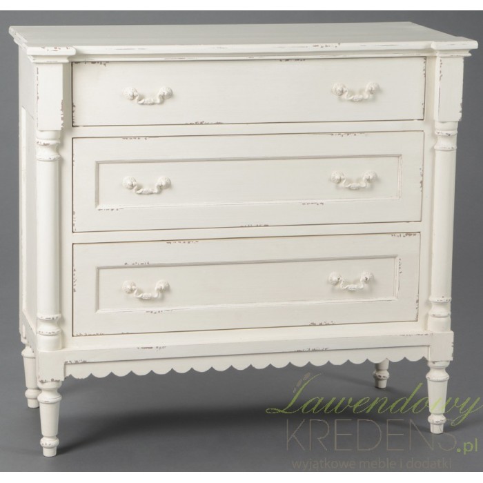 Lekko postarzana na powierzchni, biała komoda w stylu prowansalskim to mebel, którego nie mozże zabraknąć w Twojej przestrzeni. Opierając się na nóżkach, komoda prowansalska wydaje się wyższa i masywniejsza, co oczywiście nie odbiera jej niczego z jej wartości. Zwróć uwagę na falbankowe zakończenie na dole!