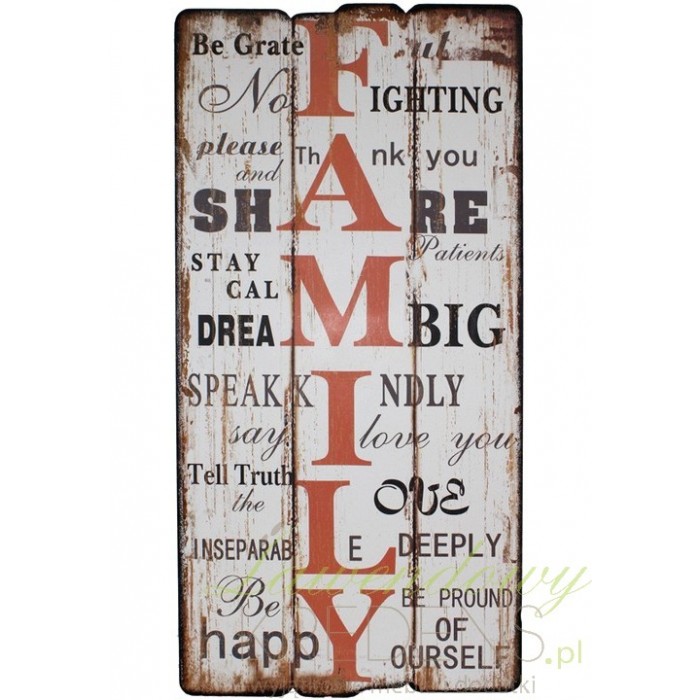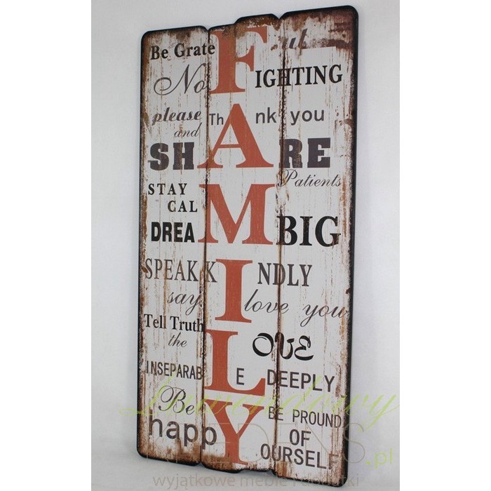 Dodatki w stylu retro, a wśród nich obrazy retro w niezwykły sposób zaczarują wnętrze twojego domu. Są wspaniałą ozdobą mieszkania, która nada mu nowy styl i szyk. Obraz retro posiada wiele małych angielskich napisów, które łączą się w całość, dzięki dużemu napisowi FAMILY. Ma on czerwony kolor i przechodzi przez środek obrazu, stanowiąc jego główną dekorację.