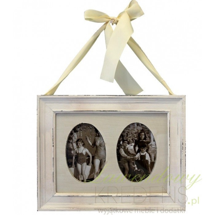Podwójna ramka na zdjęcia w stylu prowansalskim w kremowej postarzanej oprawie, wisząca na ozdobnej wstążce!