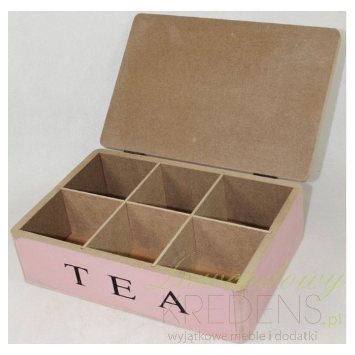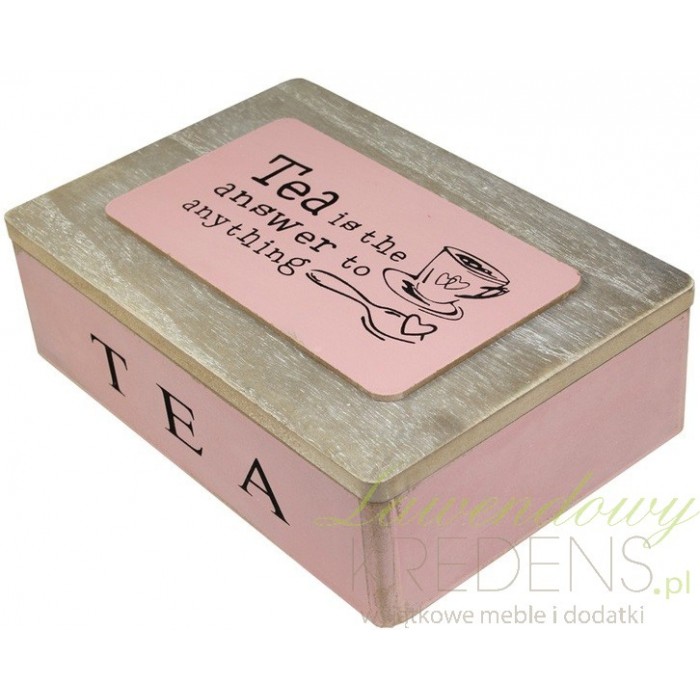Prostokątny pojemnik na herbatę z sześcioma przegódkami, w których możeszprzechowywać swoje ulubione herbaty. Boczna powierzchnia w kolorze różowym z napisem TEA świetnie komponuje się ze znajdującą się na wieczku tabliczką z angielskim cytatem i grafiką filiżanki z herbatą! Dodatki do kuchni to podstawa pięknego wnętrza!