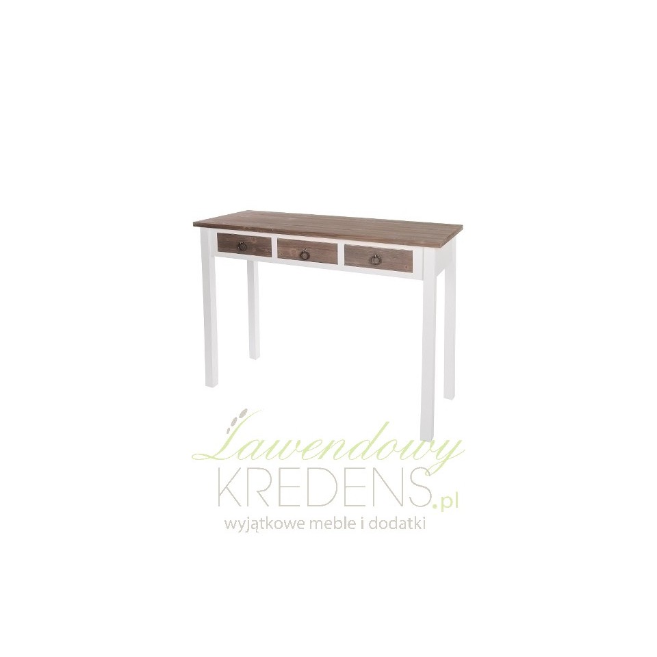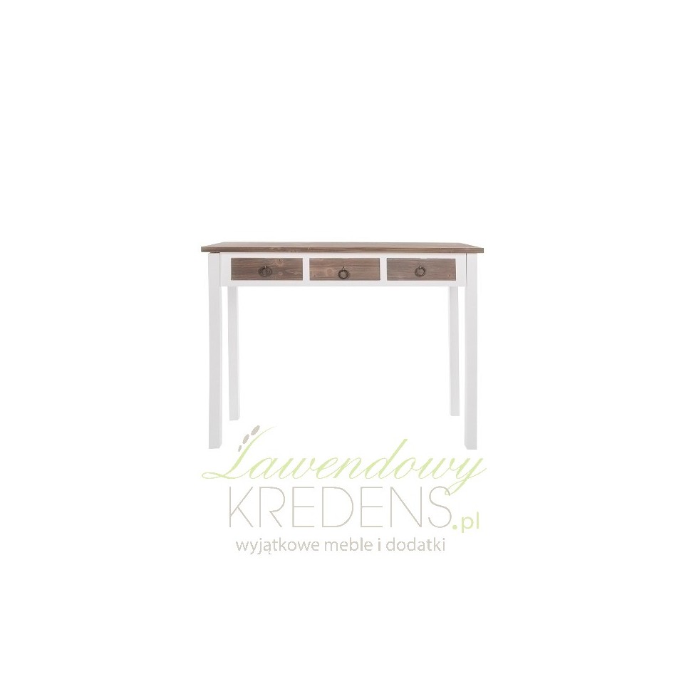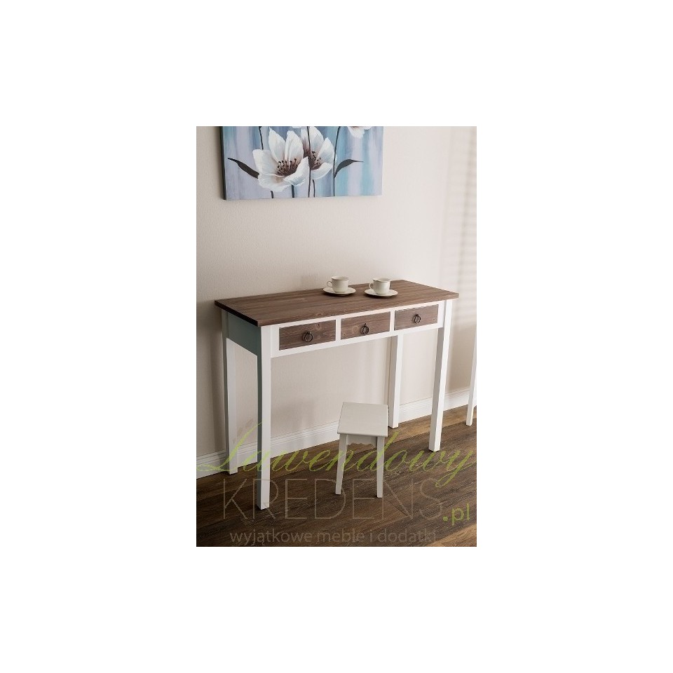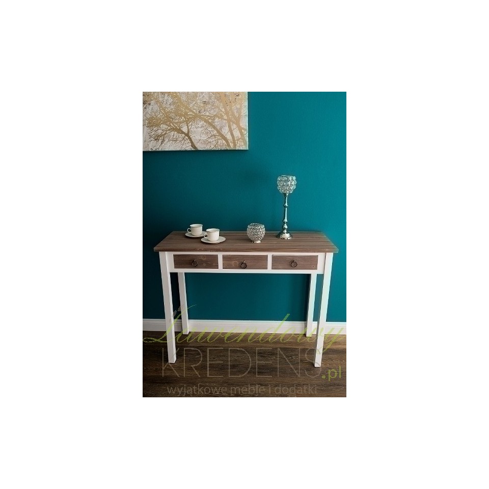Ciekawa konsola prowansalska, która może również z powodzeniem wystąpić w roli niewielkiego biurka z szufladami. Koncepcja połączenia dwóch kolorów: bieli i brązu z widocznymi na powierzchni słojami to strzał w dziesiątkę, gdyż takie połączenie nie tylko wygląda rewelacyjnie, to jeszcze pięknie komponuje się z każdym wnętrzem!