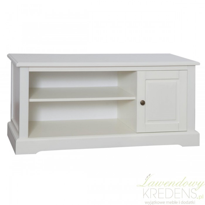 Elegancka i solidna, kremowa komoda RTV wykonana w stylu prowansalskim z dwoma półeczkami i szafeczką!
