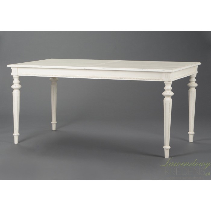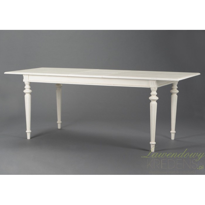 Meble w stylu prowansalskim zauroczą nas swoim kształtem i nietuzinkowym wyglądem. Stół prowansalski z kolekcji Perla jest dużych rozmiarów i w kolorze antycznej bieli. Jest rozkładany, dzięki czemu idealnie nadaje się na imprezy rodzinne. Stół rozkładany ma charakterystyczne, pięknie rzeźbione nogi i gładki, prosty blat.