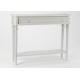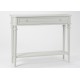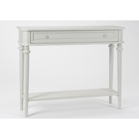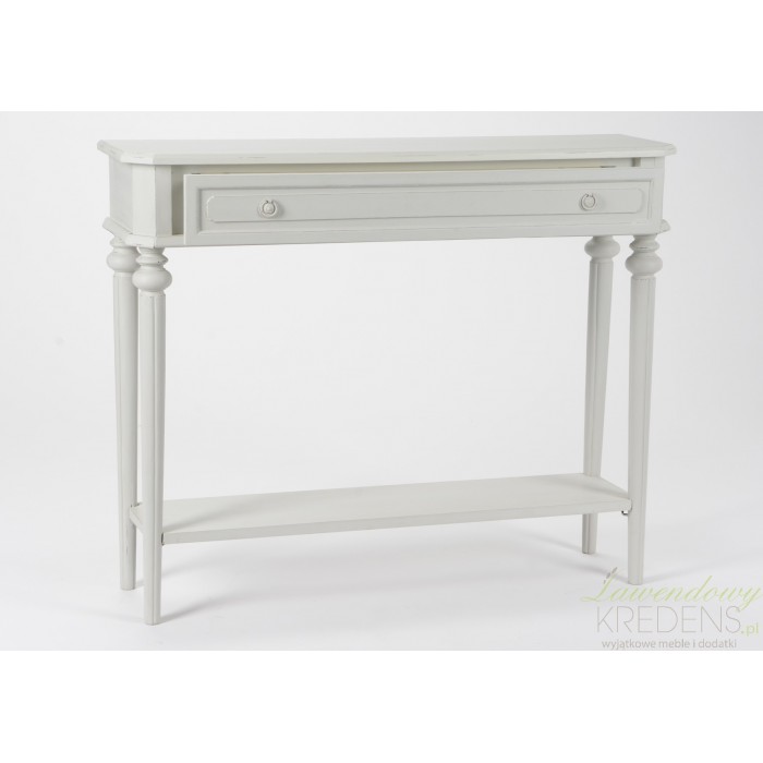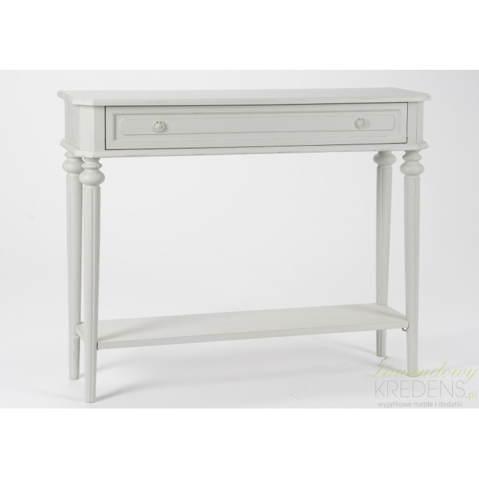 Opierająca się na czterech nogach szara konsola w stylu prowansalskim, posiadająca praktyczną, dolną półkę!