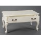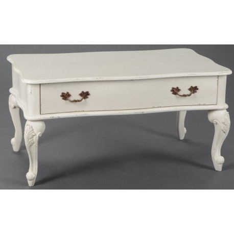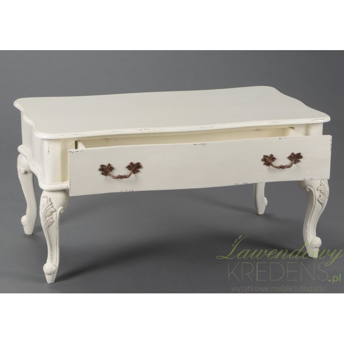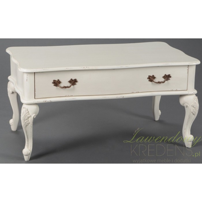 Biały, przecierany stolik kawowy z jedną, dużą szufladą na całej długości, otwieraną dwoma ozdobnymi uchwytami. Jeśli zwrócimy uwagę na nogi stolika łatwo zauwazymy, że są one pięknie zdobione delikatnie wypukłymi ornametami z motywek roślinnym. Celowe przetacia i zadrapania farby odzwierciedlają prowansalski styl tego wyjątkowego mebla!