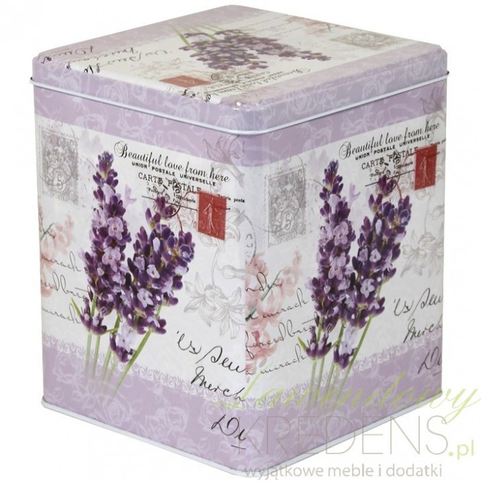 Zamykane górnym wieczkiem puszki z lawendą to wykonane z metalu pojemniki, pokryte wyrazistymi rysunkami na tle prowansalskich motywów, w tym m.in. stempli, znaczków czy niewyraźnych napisów. Kwadratowy profil pudełka o dużej przekątnej z pewnościa ułatwi wyjmowanie znjadujących się w nim rzeczy. Pojemniki z lawendą - świetna dekoracja Twoich półek!
