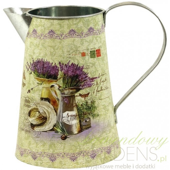 Pojemny, metalowy dzbanek z prowansalskimi motywami lawendy, okraszonej przedmiotami codziennego użytku!