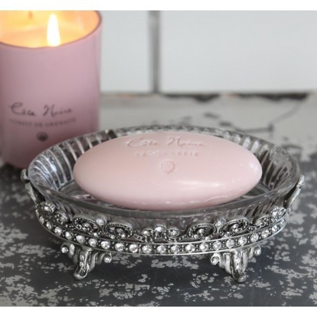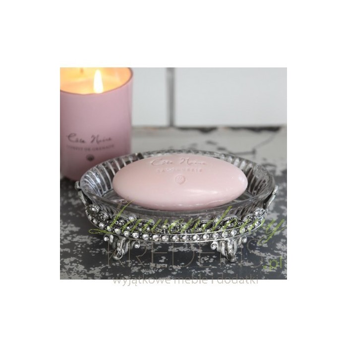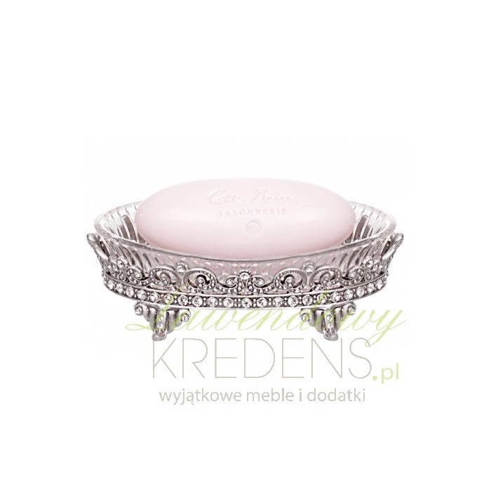 Śliczna, metalowa mydelniczka od marki Chic Antique, ustawiona na bogato ozdobionej konstrukcji na nóżkach. Pomiędzy metalowymi elementami widoczne są polyskujące w blasku światła kryształki, które w połączeniu ze szklaną, wzorowaną na krysztale podstawce tworzą urokliwą całość!