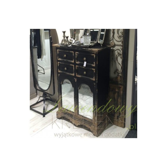 Oto komoda prowansalska od firmy Chic Antique, charakteryzująca się z jednej strony czarną postarzaną powierzchnią z licznymi śladami otarć czy wręcz odrapań farby, z drugiej wyjątkowymi półkami, których drzwiczki ozdobione zostały lustrzanymi powierzchniami. Taki mebel w domu to prawdziwe dzieło sztuki!