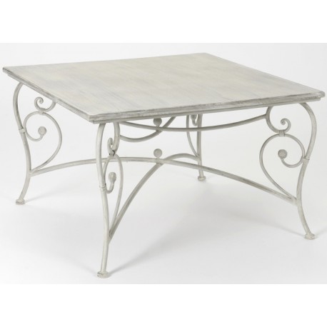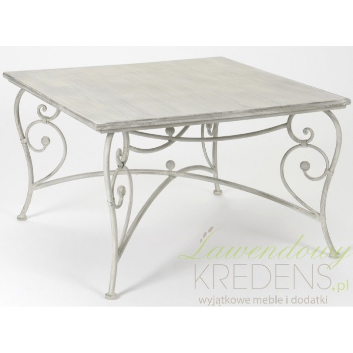 Bardzo dekoracyjny stolik kawowy prowansalski, na którego metalowej podstawie znalazł się drewniany blat!