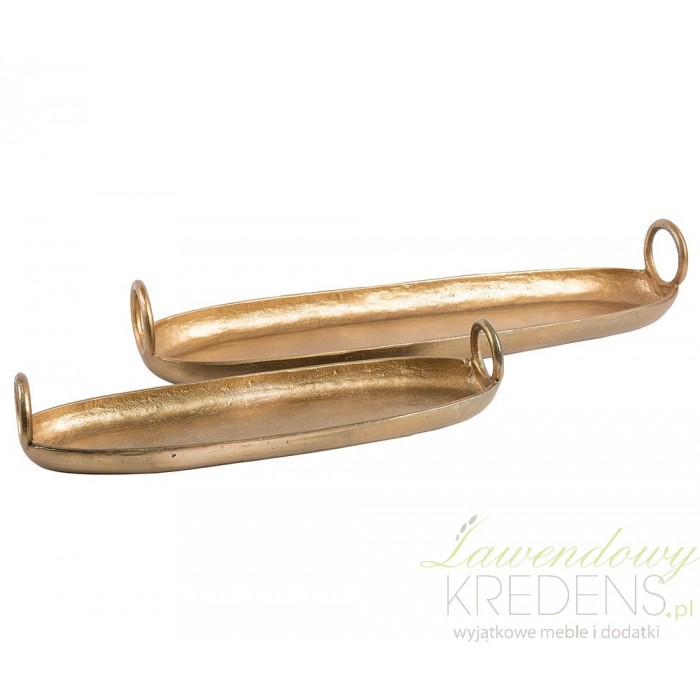 Metalowa taca wykonana jest z dobrej jakości aluminium w kolorze złotym. Ma duże wygodne i okrągłe uchwyty, dzięki czemu z łatwością można ją przenieść w inne miejsce. Podłużna taca firmy Belldeco wspaniale będzie wyglądać na twoim stole i będzie stanowić niezapomnianą dekorację stołu.