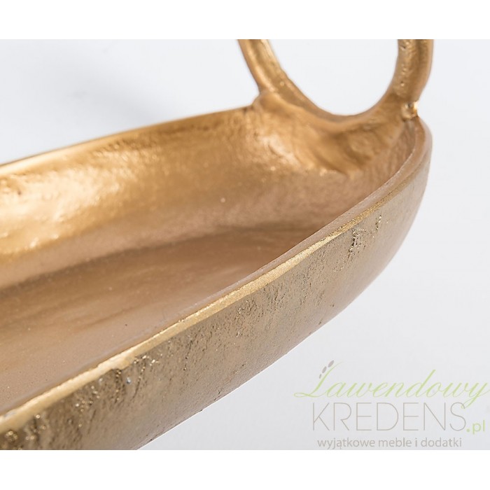 Podłużna taca to świetny pomysł na ciekawe przedstawienie przekąsek czy też owoców. Metalowa taca firmy Belldeco ma złoty kolor, dzięki czemu zaskarbi sobie miłość każdej Pani domu. Świetnie będzie wyglądać na szafce czy stole rozświetlając ją i nadając blasku. Może być również wspaniałym pomysłem na prezent.