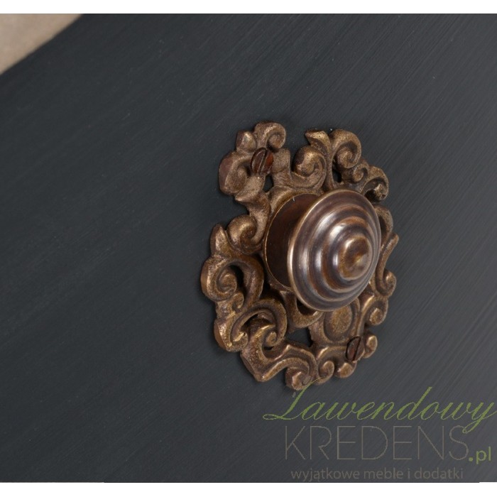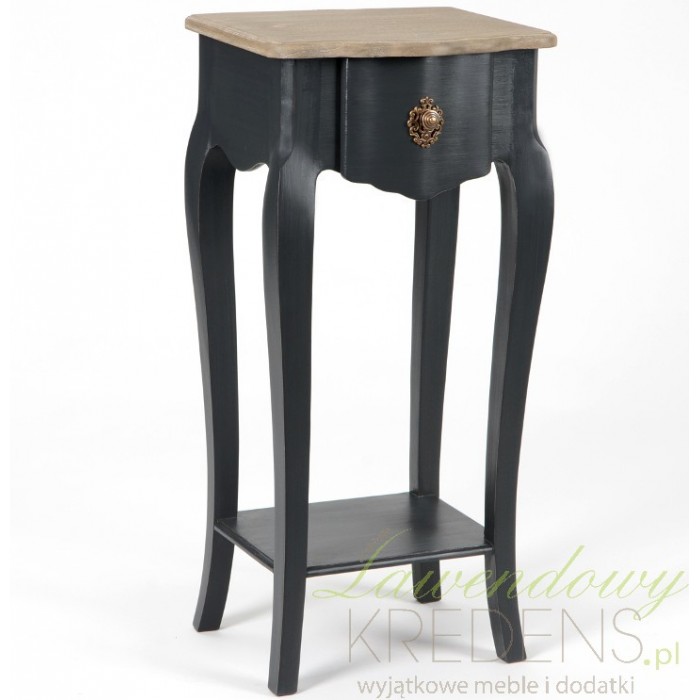 Czarny stolik o prowansaslkiej linii i wykończeniu, przywodzący na myśl także stoliczek na wazon z kwiatami czy wysoki stolik nocny. Mebel te świetnie się prezentuje we wnętrzu o pastelowych kolorach, zdecydowanie zaznaczając swoją obecność ciemnym kolorem.