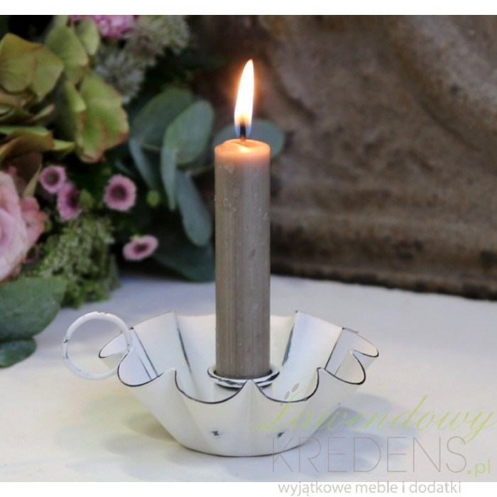 Biały świecznik na długą świece, wzorowany na klasycznych miejskich świecznikach, z odpowiednim uchwytem ułatwiającym poruszanie się po domu ze źródłem światła. Wysoka obudowa, mająca kształt fromy do babki piaskowej nie stwarza zagrożenia wycieku wosku na podłogę czy stolik.